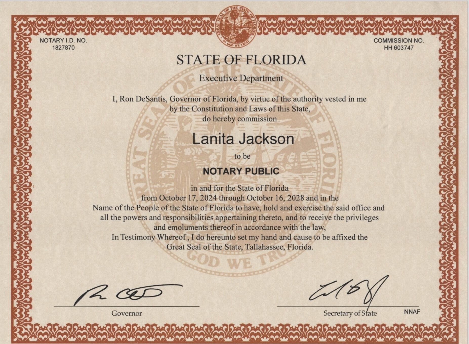 Benefit from our licensed Florida Notary services for your official document needs. Whether you require notarization for legal documents, contracts, or other paperwork, our reliable and efficient notary services ensure accuracy and compliance. I am fully mobile and will come to your location.